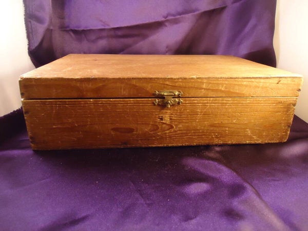 - Licht gekleurde houten kist, houtsoort onbekend. Met aan de voorkant van de kist een goudkleurige pin sluiting. Binnen in de kist is een vakken verdeling van 4 vakken allen een andere afmeting.