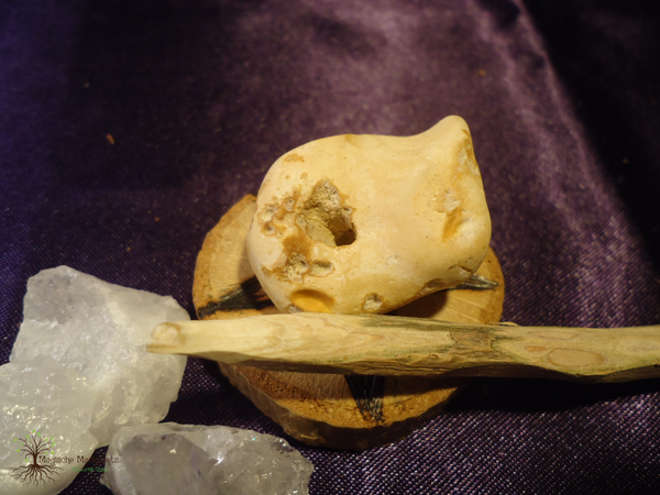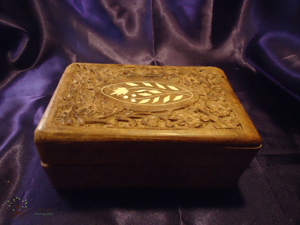 In dit kleine houten kistje met mooie bloemmotieven zijn een aantal benodigdheden voor het uitvoeren van magische reinigingsrituelen bijeengebracht.